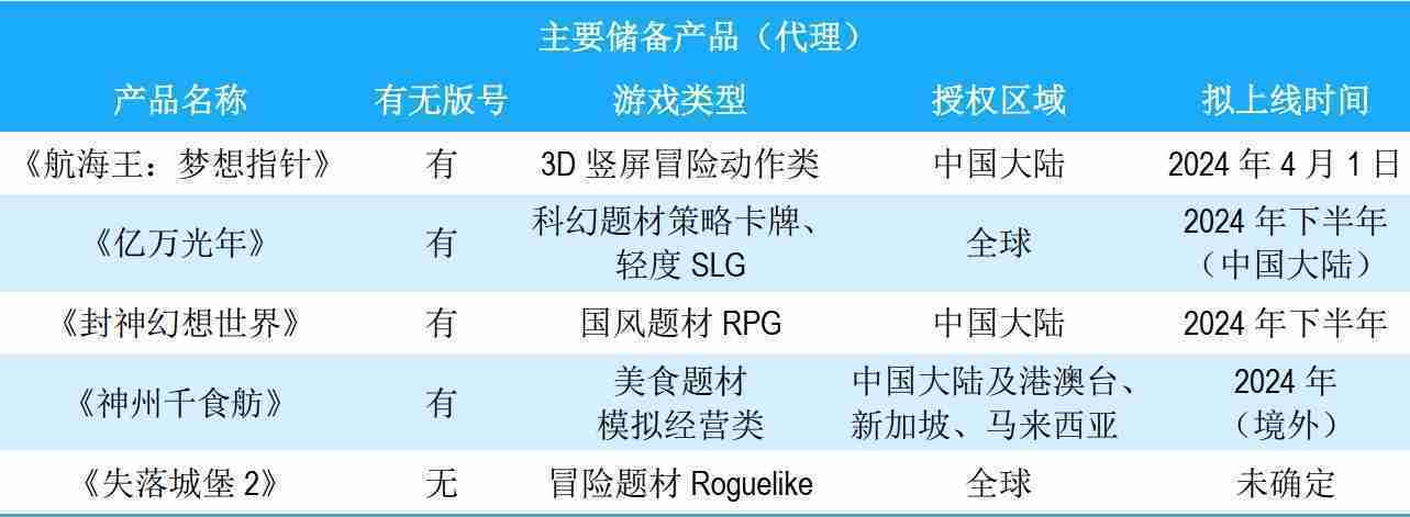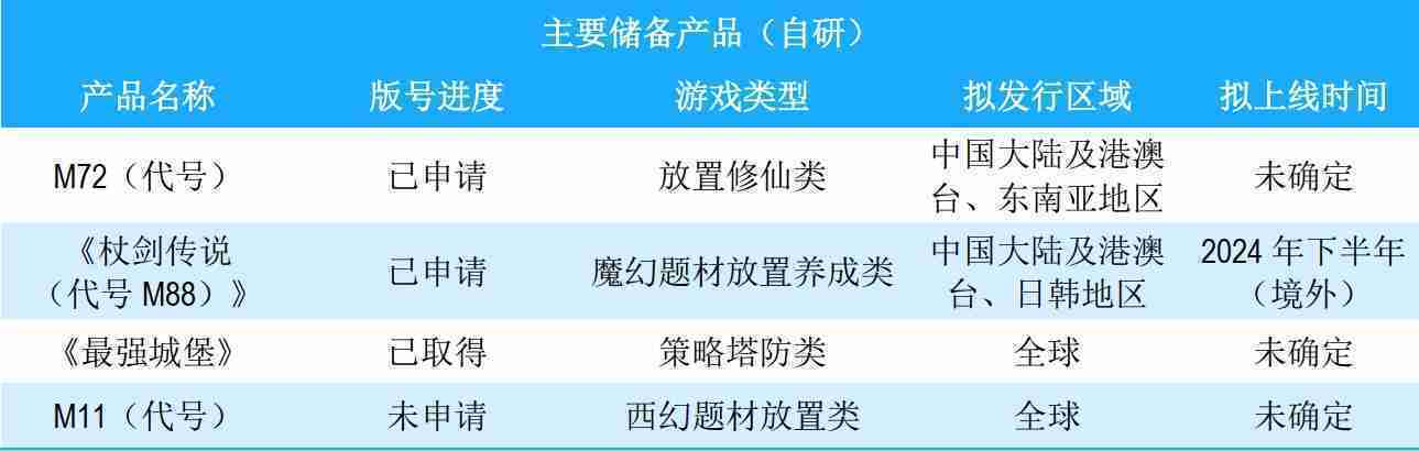 公司储备的多个自研、、、代理产品都在有序推进当中,,,涵盖放置类、、、策略类、、模拟经营类、、RPG、、Roguelike等多元化游戏品类,,,储备的主要自研和代理产品如下::
